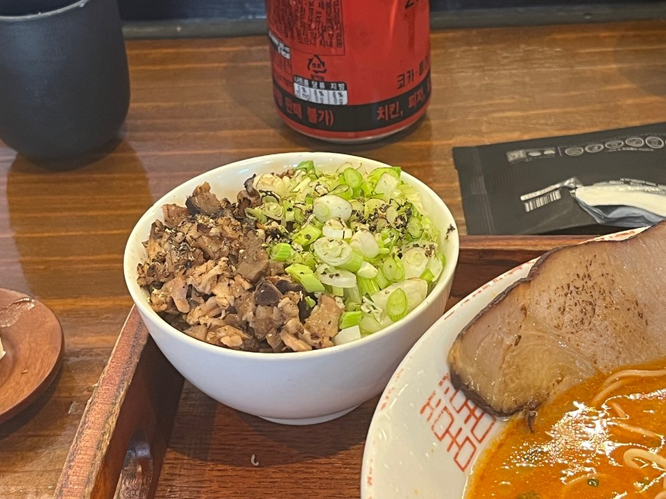 면은 적당히 탄력이 있어 국물과 잘 어울렸고, 차슈는 부드럽고 입에서 살살 녹는 식감이었습니다. 라멘 위에 올라간 파, 목이버섯, 반숙 계란까지 조화롭게 어우러져 완벽한 한 그릇을 완성했습니다.